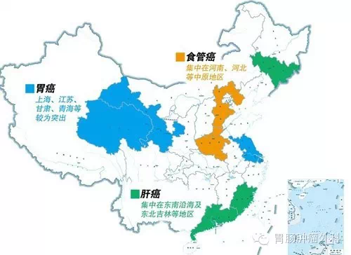 胃癌发病有明显的地域性差别,在我国的西北与东部沿海地区胃癌发病率比南方地区明显为高。我国胃癌高发区为:与饮食习惯有关山东、辽宁、福建、甘肃、青海、宁夏、吉林、江苏、上海等地;与地质水质有关的如祁连山内流河系的河西走廊、黄河上游、长江下游、闽江口、木兰溪下游及太行山南段等地。